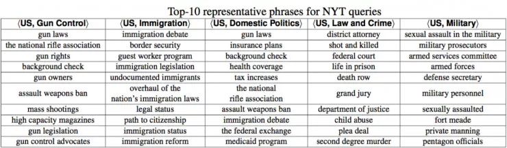 使用这种方法,韩家炜领导的小组通过 NY Times 在 2016 年的新闻很容易就挖掘出了当时美国两党辩论过程中的主要议程(例如<US, Gun Control>、<US, Immigration>等)Top 10 的关键信息。