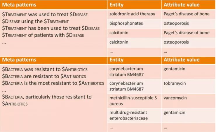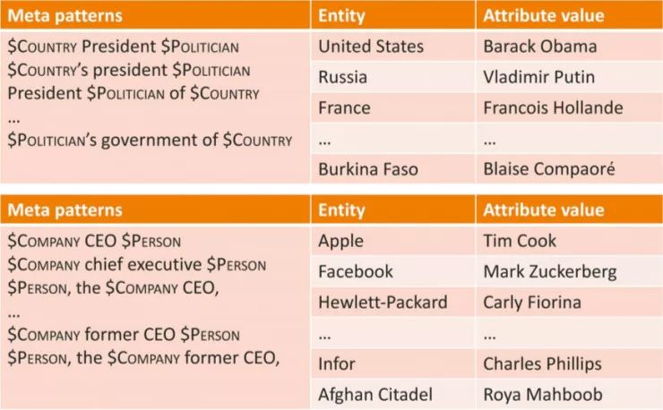 从上面这个图可以很清晰看出他们的工作流程:对语料文本进行 Meta Pattern 分割,得到 Meta Pattern;通过 Meta Pattern 可以找到大量相符的三元组;再通过这些三元组数据进一步地改进 Meta Pattern,例如提升粒度或获得同义的 Meta Pattern。值得注意的是,这种方法并不需要大量的标注数据,也不需要相应的领域知识,同样也不需要搜索日志。
