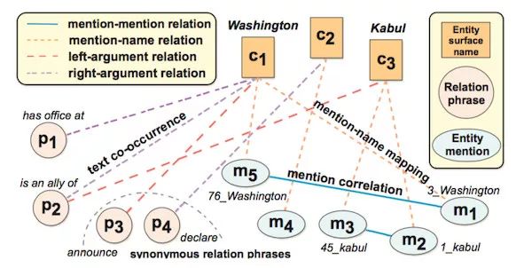 将 Surface Name 、Phrase 和 Entity Mention 连接起来,其中两个对象越有可能共享相同的 label,连接它们的边的权重就越大。