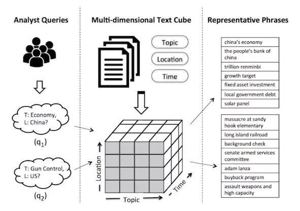 一个现实的问题就是,假如给你 100 万个 Documents,而只有少量几个标签(例如上述 Location、Topic 的标签),那么你能否自动地生成成百上千的标签,并将文本正确地放入到这些标签构建的多维 Text Cube 中呢?