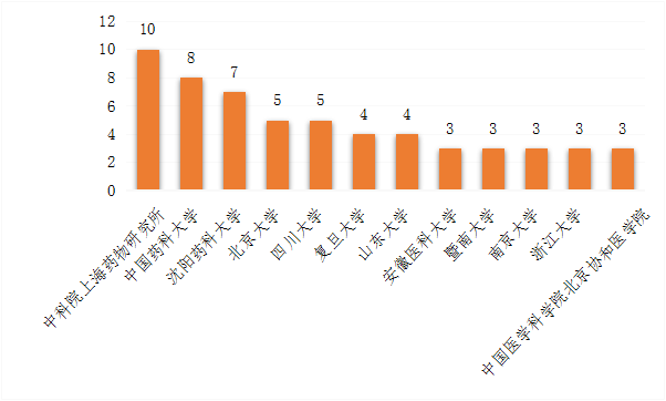 药学学科高被引学者 82 人,分布在全国 32 个机构。高被引学者数量最多的前三机构为中科院上海药物研究所、中国药科大学、沈阳药科大学。沈阳药科大学、安徽医科大学、协和医学院是前十强中非 211/985 高校。前十强机构如下: