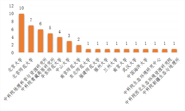地理学学科高被引学者 47 人,分布在全国 17 个机构。高被引学者数量最多的前三机构为北京大学、北京师范大学、中科院地理科学与资源研究所。地理学科高被引学者分布的 17 家机构如下图所示: