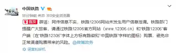 “中国铁路”官方微博发布消息回应此事称,网传信息不实,铁路12306网站未发生用户信息泄露。