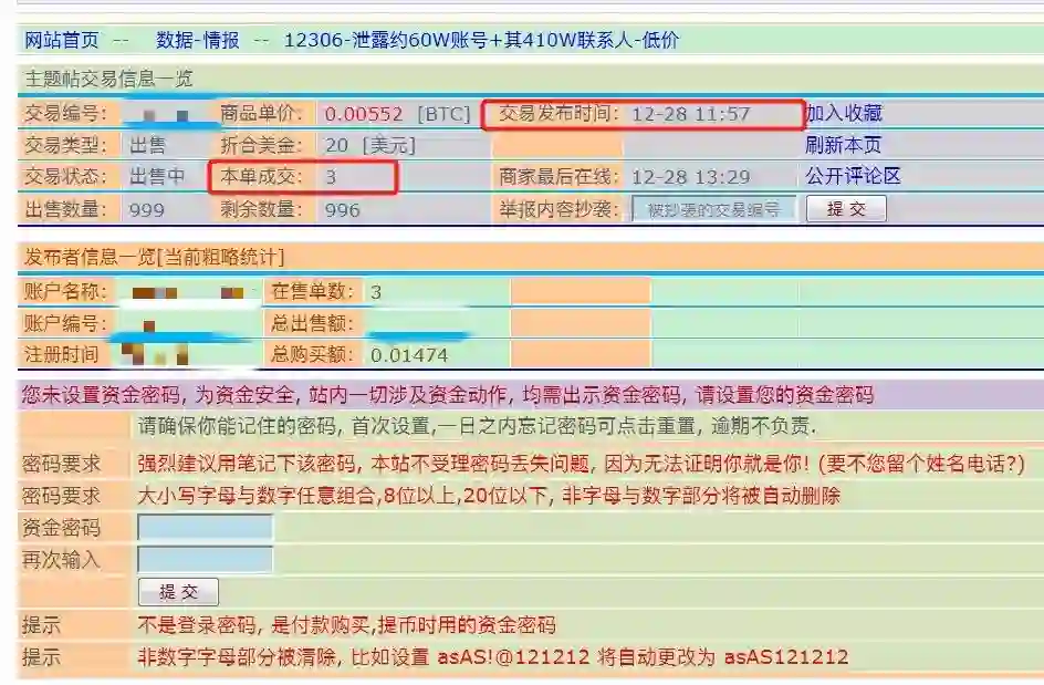 在暗网上,这份自称包含了60万12306账号以及410万常用联系人的数据包售价是20美元,格式为EXCEL表格,如果需要转为数据库格式则需要另加5美元。可见这位卖家“熟稔此道”。截止记者发稿前,这个数据包已完成3笔交易。