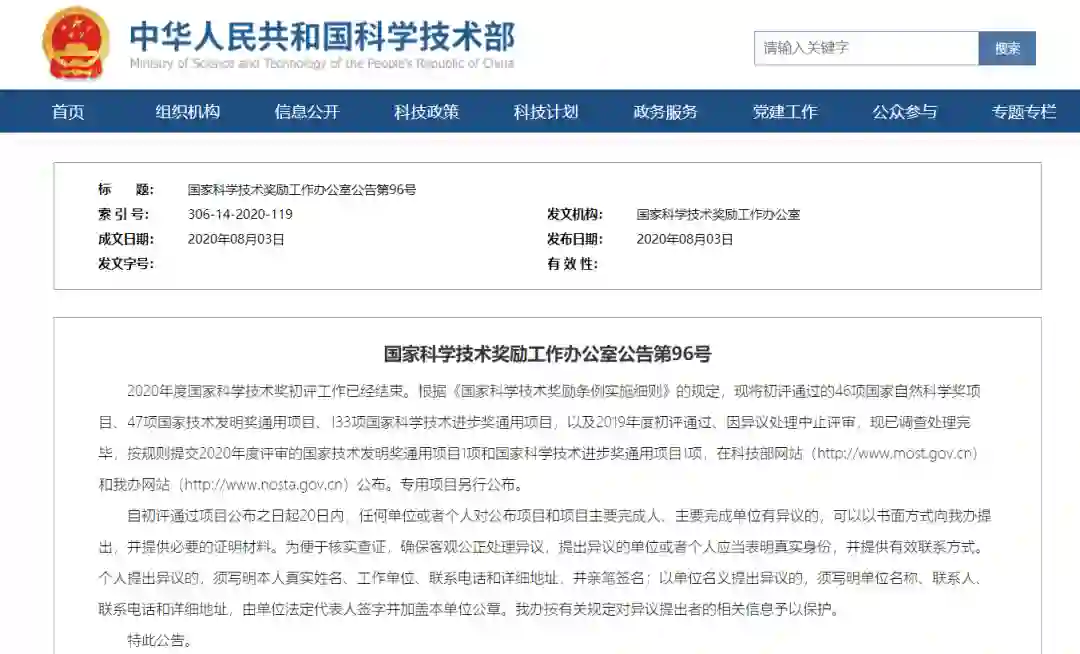 8月3日,国家科学技术奖励工作办公室公布了2020年度国家科学技术奖的初评结果,本年度初评通过46项国家自然科学奖项目、47项国家技术发明奖通用项目、133项国家科学技术进步奖通用项目。专用项目另行公布。