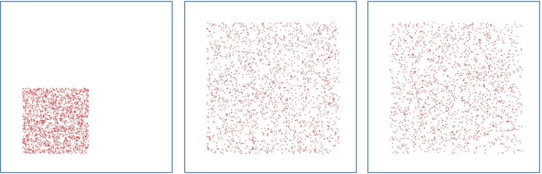 图5. 珠子在盒子中的不同分布状态。左图:珠子集中于左下角;中图:珠子由无形的尺子连接;右图:珠子随机分布。你能看出中图和右图的区别么? (图源:尔欣中)