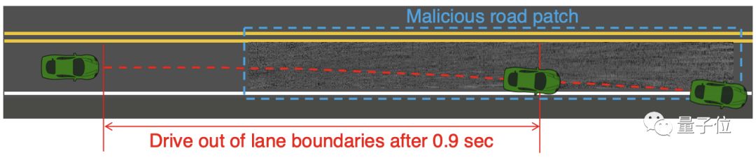 在论文中,他们使用不覆盖车道线的“脏路补丁”作为攻击载体,在最先进的开源车道保持辅助系统OpenPilot上测试:攻击126公里时速的车辆,只需要0.9秒就能让它失控;72公里时速行驶下的汽车,只需要1.3秒。