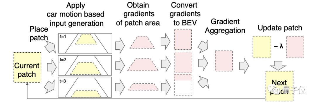 基于这样的目标函数,可以得到每个摄像机输入的梯度。但梯度下降并不能直接适用于更新恶意路面修复补丁。