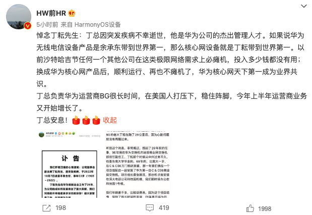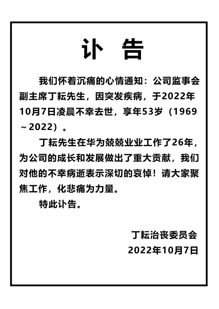 讣告表示,“丁耘先生在华为兢兢业业工作了 26 年,为公司的成长和发展做出了重大贡献,我们对他的不幸病逝表示深切的哀悼!”