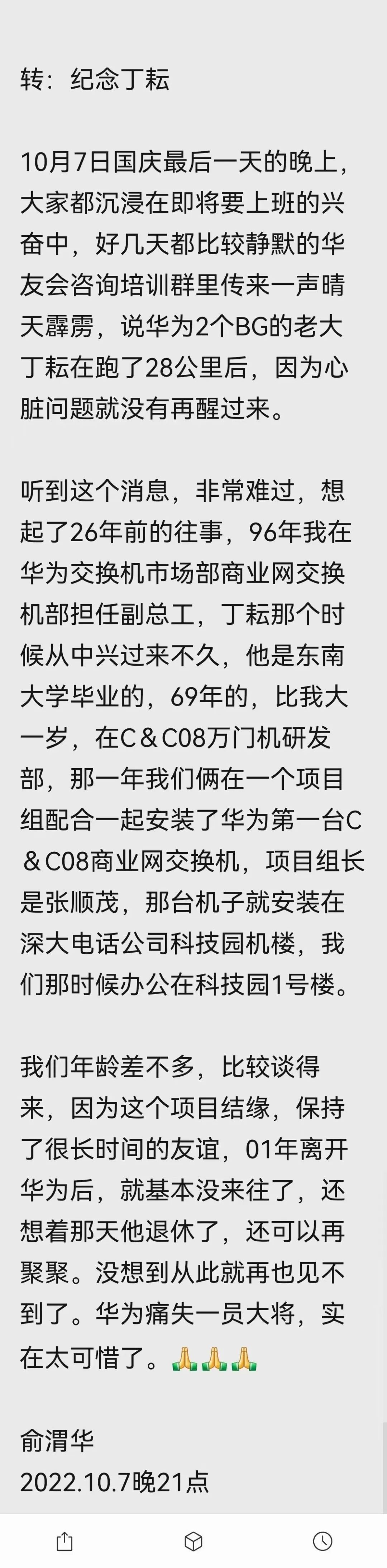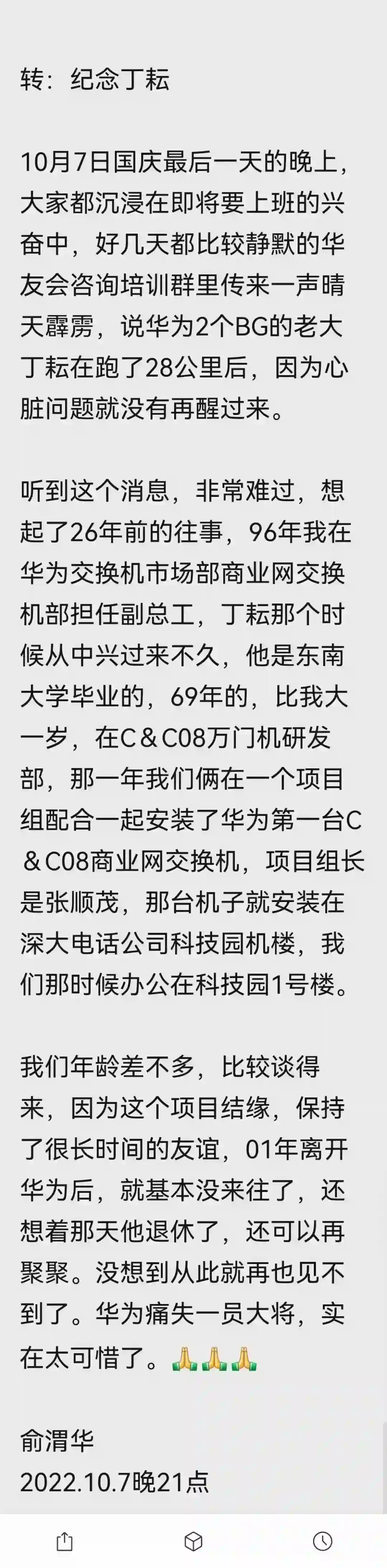世事无常。在国庆假期的最后一天,突闻噩耗,“华为家事”认证账号昨晚在心声社区发布了一则讣告: