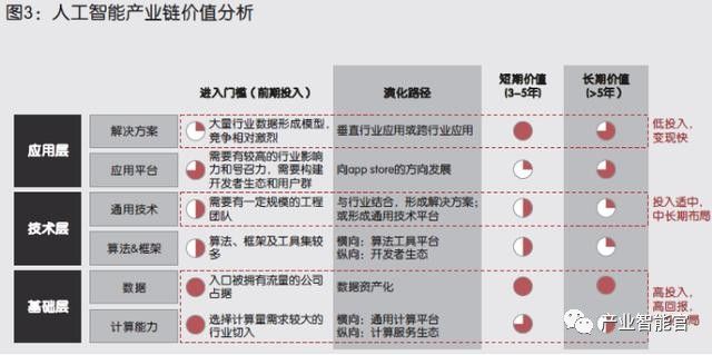 人工智能产业链中,基础层是构建生态的基础,价值最高,需要长期投入进行战略布局;通用技术层是构建技术护城河的基础,需要中长期进行布局;解决方案层直戳行业痛点,变现能力最强(参阅图3)。