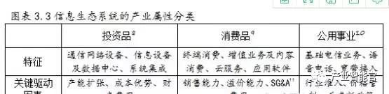 (1)规模经济圈:主要包括电信网络、数据中心、宽带接入服务、IAAS服务等细分行业。其中,电信网络和数据中心均属于基础设施投资层面,通常由运营商或政府投资,归属于投资品(见图表3.2),产能扩张、产品成本、财务费用是企业业绩驱动的关键因素。宽带接入服务和Iaas服务属于居民普遍服务的范畴,就长期发展趋势而言,其行业特性逐步向公共事业演变,行业准入、价格管制和反垄断政策是决定企业能力的核心要素。