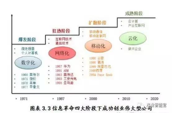 在整理了当今伟大的全球信息技术企业的成立时间可以看到,信息化浪潮始于日本而,而后向北美、欧洲和亚洲转移。在20世纪30-60年代,信息技术创新型企业多发生在日本,在这期间成立的公司如:富士通、松下电器、夏普、佳能、索尼、爱普生等;1960年以后,北美的创业型公司爆发式增长,如:英特尔、戴尔、EMC(易安信)、苹果、微软、SAIC等;20世纪80年代后,伟大型的公司多出现在亚洲和北美,如:甲骨文、思科、戴尔、Twitter、Facebook、Google、Salesforce,中国的公司如:联想、中兴、华为、华硕、腾讯、阿里巴巴、百度等。