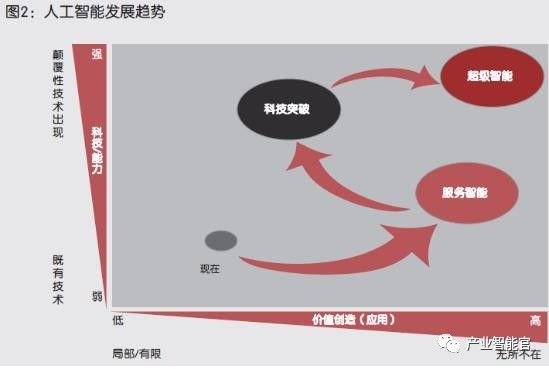 情景三:长期可能出现超级智能。人工智能的技术取得显著突破,应用范围显著拓宽,人机完全共融,人工智能全面超越人类,无所不在,且颠覆各个行业和领域,价值创造极高。