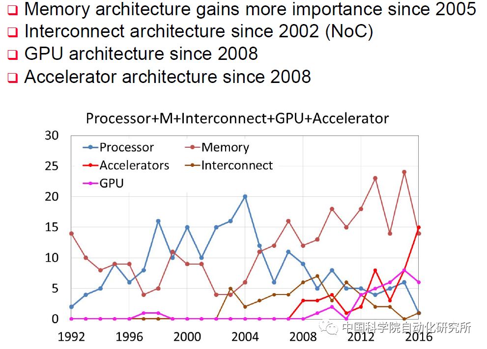 不论是赢得视觉识别挑战赛的AlexNet,还是击败围棋冠军柯洁的AlphaGo,它们的实现都离不开现代信息技术的核心——处理器,不论这个处理器是传统的CPU,还是GPU,还是新兴的专用加速部件NNPU(NNPU是Neural Network Processing Unit的简称)。在计算机体系结构国际顶级会议ISCA2016上有个关于体系结构2030的小型研讨会,名人堂成员UCSB的谢源教授就对1991年以来在ISCA收录的论文进行了总结,专用加速部件相关的论文收录是在2008年开始,而在2016年达到了顶峰,超过了处理器、存储器以及互联结构等三大传统领域。而在这一年,来自中国科学院计算技术研究所的陈云霁、陈天石研究员课题组提交的《一种神经网络指令集》论文,更是ISCA2016最高得分论文。