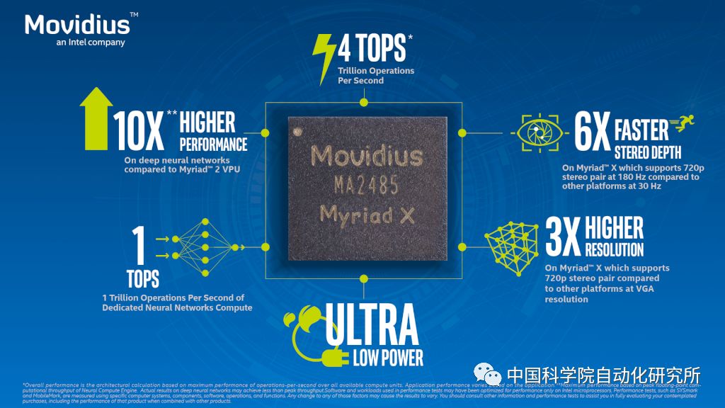 Myriad X就是英特尔子公司Movidius在2017年推出的视觉处理器(VPU,vision processing unit),这是一款低功耗的系统芯片(SoC),用于在基于视觉的设备上加速深度学习和人工智能——如无人机、智能相机和VR / AR头盔。Myriad X是全球第一个配备专用神经网络计算引擎的片上系统芯片(SoC),用于加速设备端的深度学习推理计算。该神经网络计算引擎是芯片上集成的硬件模块,专为高速、低功耗且不牺牲精确度地运行基于深度学习的神经网络而设计,让设备能够实时地看到、理解和响应周围环境。引入该神经计算引擎之后,Myriad X架构能够为基于深度学习的神经网络推理提供1TOPS的计算性能。