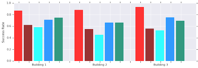 在几座建筑物中导航超过100米的成功率。第一篇论文 --AutoRL仅限本地策划人(蓝色); 原始PRM(红色); 路径引导的人工势场(黄色); 第二篇论文(绿色); 第三篇论文 - 使用AutoRL(橙色)的PRM。