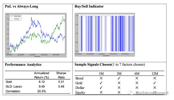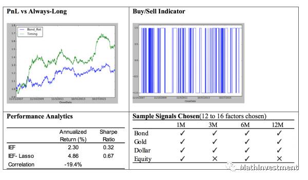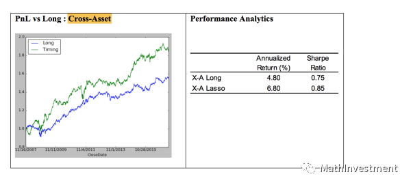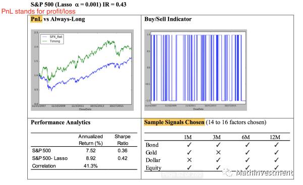 我们可以看到预测S&P500的lasso model用到了14个factors。并且单纯做多的收益和sharp ratio都比直接买S&P500高。