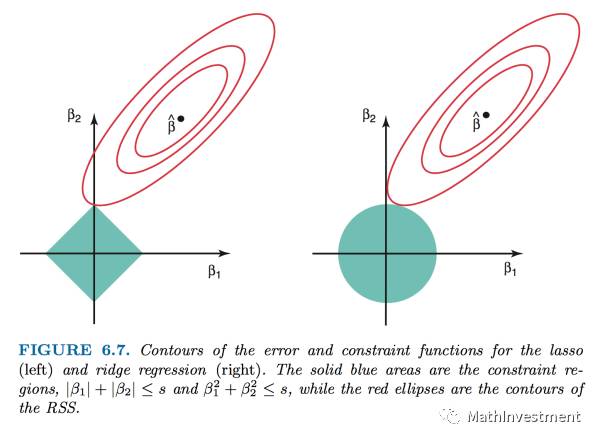 而Ridge的情况是,由于阴影面积是一个圆,所以并没有突出的顶点可以更容易跟椭圆相切,故想要正好相切在坐标轴上是非常困难的,需要RSS的形状满足非常极端的条件才行。