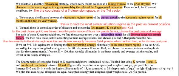 我们将过去的10年每个月都可以画在这7-d indicator的空间中,每一个月都可以被这个空间内的一个点所代表其宏观情况。这样当下这个月也可以画在同样一个空间里,找到其最近的K个点。当然K也可以用其他的值,这样就是average一下附近的K个点的每一个risk premia的return,这样我们可以得到这个点周围附近K个点(也就是历史上类似宏观情况的K个月)这20个risk premia每一个的平均值,(这个地方距离是standardize之后的距离还是直接用原indicator的scale呢?),这样就找到了历史上最接近现在这个月宏观经济情况的K个月的20个risk premia每一个的平均值。