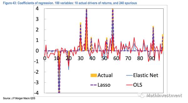 从上面这张图我们可以看到Lasso基本上把真实Actual的主要因子都抓住了,并且给予的系数(权重)基本上和真实值一致。关注私募工场ID:simugongchang,加私募工场老板娘微信guo5_guoguo。而OLS,也就是最基本的least square的方法(仅仅只有Lasso的第一项)会分配权重给全部的因子,这样就造成了overfiting。也可以看到Lasso里面加上的penalty这一项对于筛选重要的因子的还是很有效的。