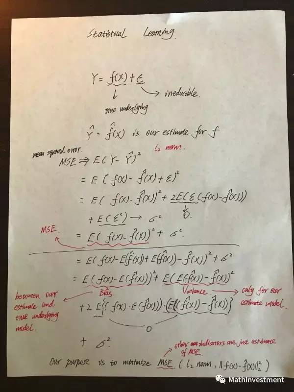 上面写的MSE其实是expected test MSE(注意我是用的箭头,不是等号),就是在我们已有的样本基础上得到的我们的model f^hat(x)和真实model f(x)之间的平方差的期望值的估计。求期望呢,实际上是对f^hat(x)求期望,因为整个MSE的式子里面唯一的变量就是我们的model f^hat(x),而f^hat(x)又是从training sample得到的,所以我们对f^hat(x)求期望实际上是对training sample的信息求期望。