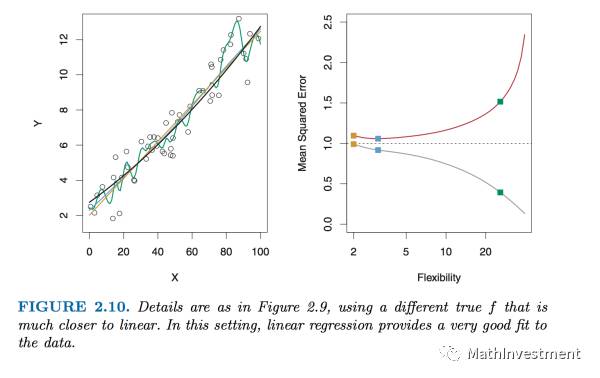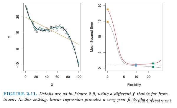 这里左图中黄线是linear regression模型,蓝线和绿线是smoothing spline模型。