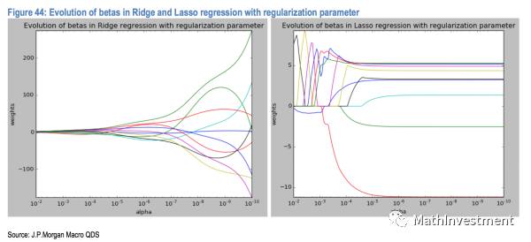 对于这个很大系数的主要因子的问题,理论上可以证明出Lasso和Ridge并不会首先将系数大的主要因子系数变为最小,而是首先将不那么重要的因子的系数变小。关注私募工场ID:simugongchang,加私募工场老板娘微信guo5_guoguo。可以从主观的感觉上面来理解,如果将主要因子的系数降低的话,会造成公式前面那个RSS这一项的值变得很大,这样即使后面penalty会减小,但整体的和不一定会降低,反而可能会升高(毕竟penalty只是一个调节的项,RSS才是想要降低的主体)。但是如果降低的是不那么重要的因子的系数,就会使得前面RSS的值增加不多,但是后面的penalty会降低不少,特别是penalty前面系数a足够大的情况下。所以综合而言,Lasso的作用是把不重要的因子剔除出去(也就是使得其前面的系数变为0)。