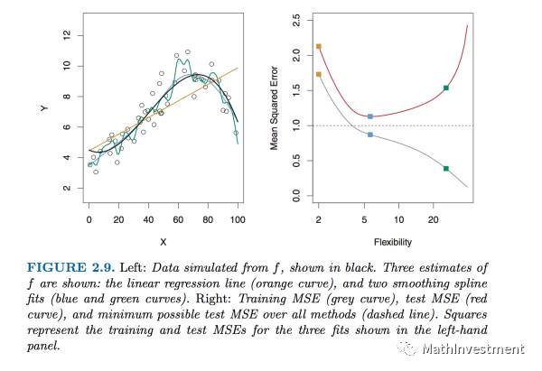 图中的点是从真实的model f(x)产生出来的,我们想做的就是用不同flexibility程度的统计方法去fit这些点,看看哪种方法的拟合效果越好。
