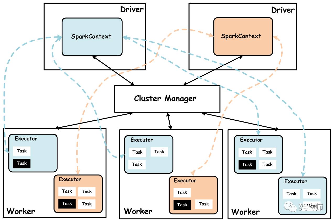 Spark集群在设计的时候,并没有在资源管理的设计上对外封闭,而是充分考虑了未来对接一些更强大的资源管理系统,如YARN、Mesos等,所以Spark架构设计将资源管理单独抽象出一层,通过这种抽象能够构建一种适合企业当前技术栈的插件式资源管理模块,从而为不同的计算场景提供不同的资源分配与调度策略。Spark集群模式架构,如下图所示: