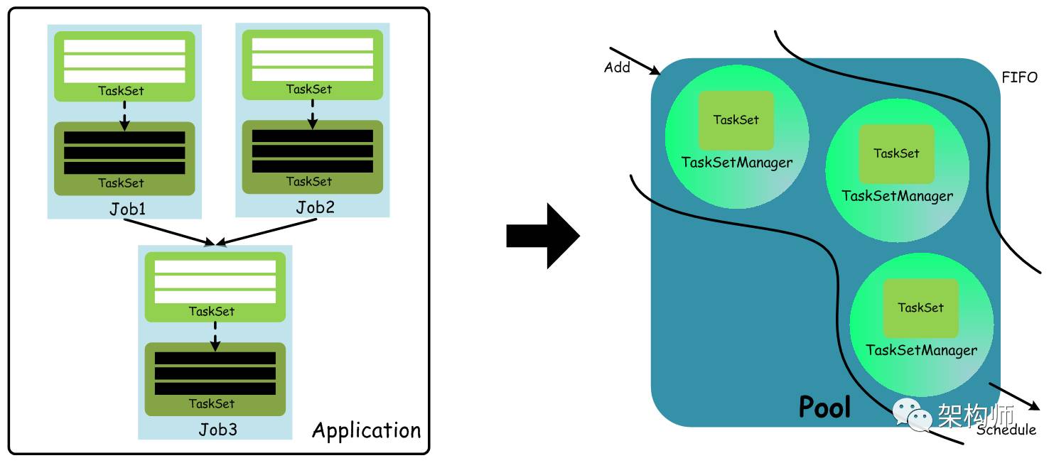 基于Stage可以直接映射为TaskSet,一个TaskSet封装了一次需要运算的、具有相同处理逻辑的Task,这些Task可以并行计算,粗粒度的调度是以TaskSet为单位的。