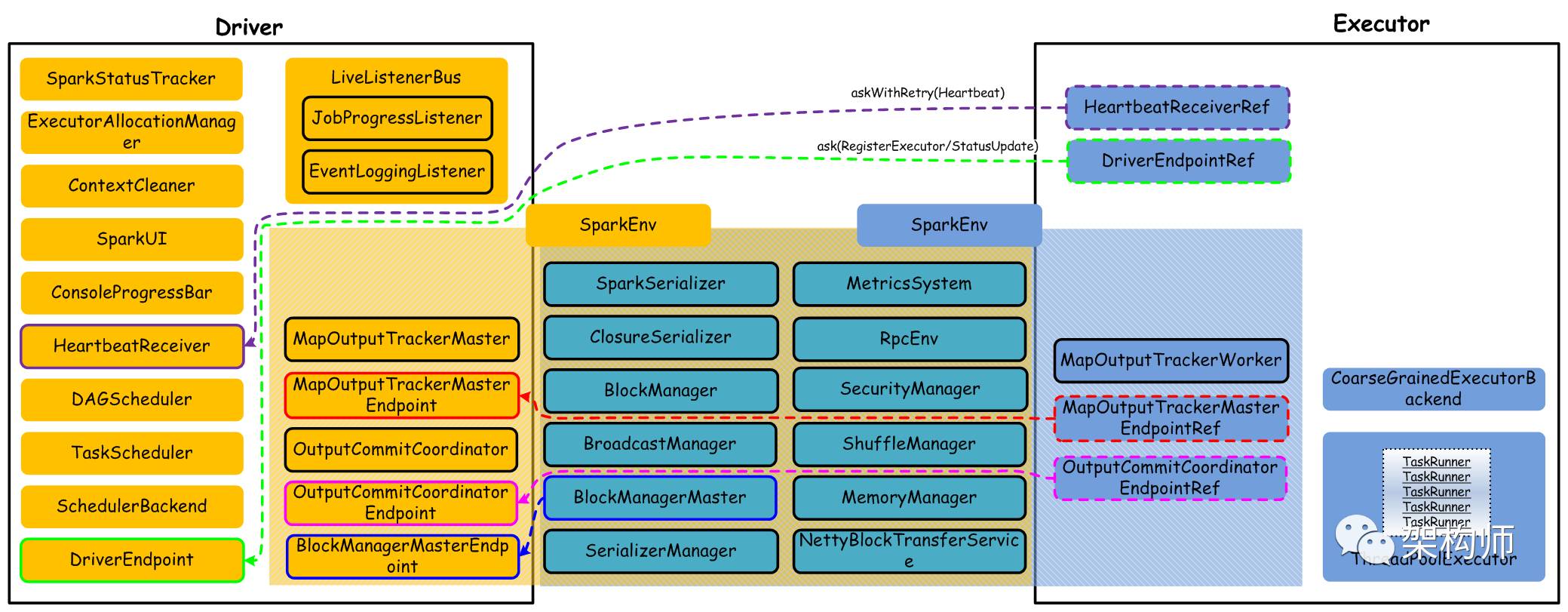 Driver和Executor都是运行时创建的组件,一旦用户程序运行结束,他们都会释放资源,等待下一个用户程序提交到集群而进行后续调度。上图,我们列出了大多数组件,其中SparkEnv是一个重量级组件,他们内部包含计算过程中需要的主要组件,而且,Driver和Executor共同需要的组件在SparkEnv中也包含了很多。这里,我们不做过多详述,后面交互流程等处会说明大部分组件负责的功能。