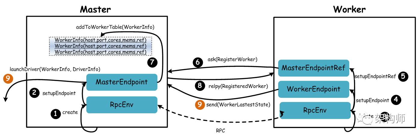 Master接收到Worker的注册,将注册信息维护在内存中的Table中,其中还包含了一个到Worker的RpcEndpointRef对象引用