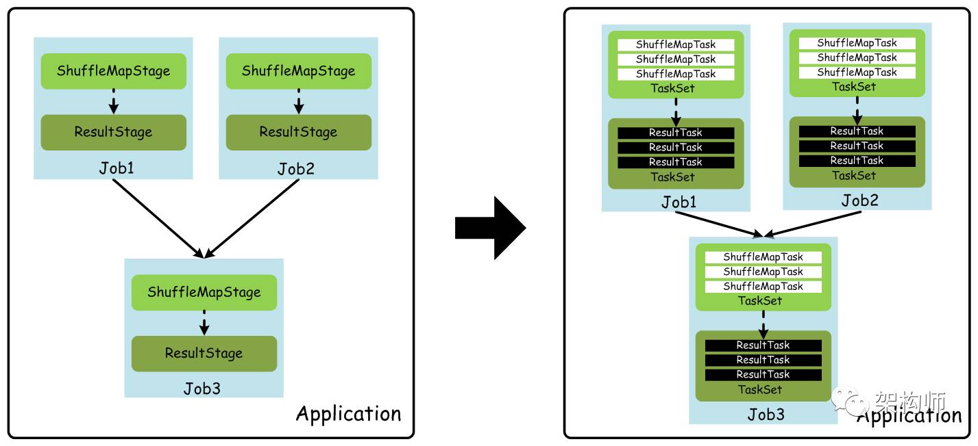 上图,为了简单,每个Job假设都很简单,并且只需要进行一次Shuffle处理,所以都对应2个Stage。实际应用中,一个Job可能包含若干个Stage,或者是一个相对复杂的Stage DAG。