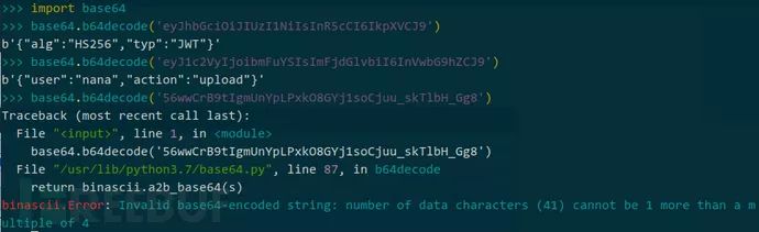第一段解码看到 JWT,第二段解码发现用户名,第三段因下划线导致解码失败。