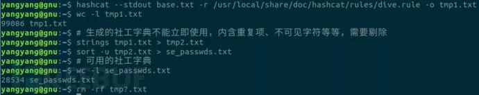 其中,dive.rule 含有我需要的规则,选之。我把 nana 视为基础信息存入 base.txt 中作为输入,让 dive.rule 模仿学习生成类似的密码字典,保存至 se_passwds.txt:
