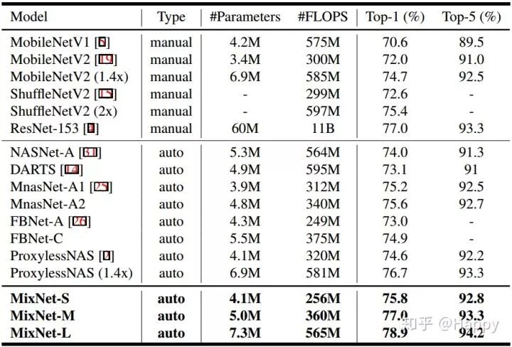 作者重新回顾了深度分离卷积中的核尺寸影响,证实了:传统深度分离卷积网络(如MobileNetV1,MobileNetV2)受限于卷几何尺寸。基于此,作者提出一种混叠深度卷积(MDConv),它可以混叠多个尺寸卷积核到同一卷积中,进而取得精度的提升。同时,作者将其应用AutoML框架中,搜索到一类新的架构MixNet。相比比已有轻量型网络,它具有更高的精度和效率(ImageNet分类与COCO目标检测任务)。