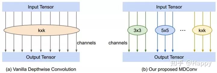 基于上述分析,作者提出一种混合深度分离卷积(MDConv),它将不同尺寸卷积核混叠到同一个卷积OP单元中,故而它可以轻易的捕获不同分辨率的特征模式。下图给出了标准深度分离卷积与本文所提MDConv示意图。