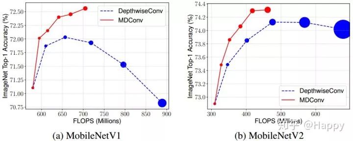 作者对比MDConv替换到MobileNetV1与MobileNetV2前后的精度对比,效果图如下。从中可以看出:相比标准深度分离卷积,MDConv更轻量、更快同时具有更高的精度