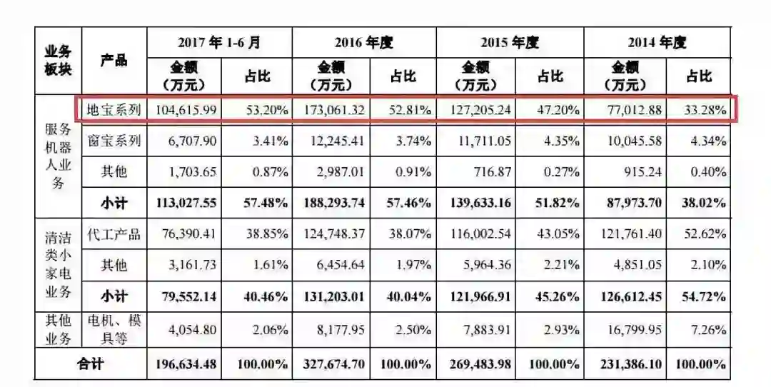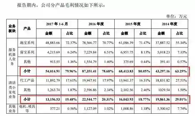 数据显示,服务机器人所占营收比在2014年仅有38.02%,2015年达到51.82% ,2016年则达到57.46%。反之,清洁类小家电业务则从54.72%下降至40.04%。