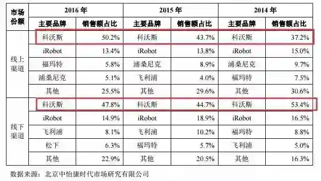近三年来,无论是线上还是线下,科沃斯销量都遥遥领先iRobot、海尔、浦桑尼克、福玛特、美的等。