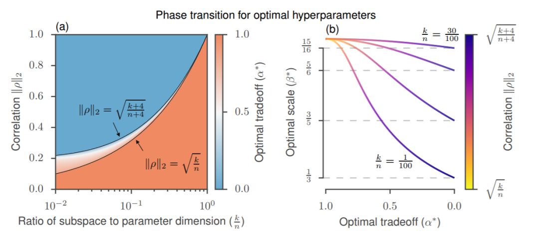 图 3:选择最优超参数。(a)阴影区域显示了在平面中最优超参数的不同机制。细节请参阅 3.4 节。(b)随着