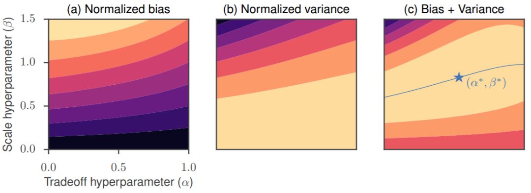 图 2:在带引导的进化策略中对偏置-方差权衡进行探索。归一化偏置˜b 的等高线图(a),归一化方差 v˜的等高线图(b),以及前面二者之和的等高线图(c)。它们是关于权衡(α)和规模(β)超参数的函数,其中,是固定的。在这些等高线图中,子空间维数被设定为 k=3,参数维数被设定为 n=100。(c)中蓝色的线表示对于每一个 α 值来说最优的 β,星标表示全局最优点。