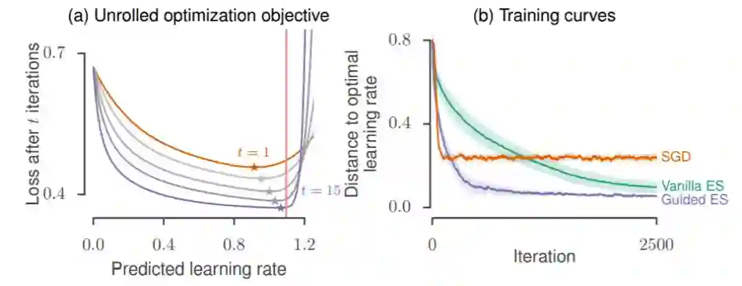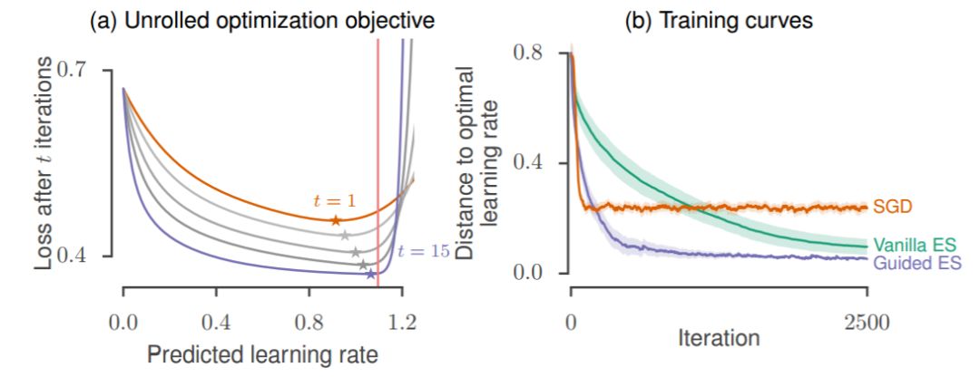 图 4:展开优化。(a)少量展开优化步骤(t)展开优化过程中的损失情况的偏置。(b)用于训练多层感知器的训练曲线(显示为与最优点的距离),它作为一个用于优化的函数的特征值的函数去预测最佳学习率。细节请参阅 4.2 节。