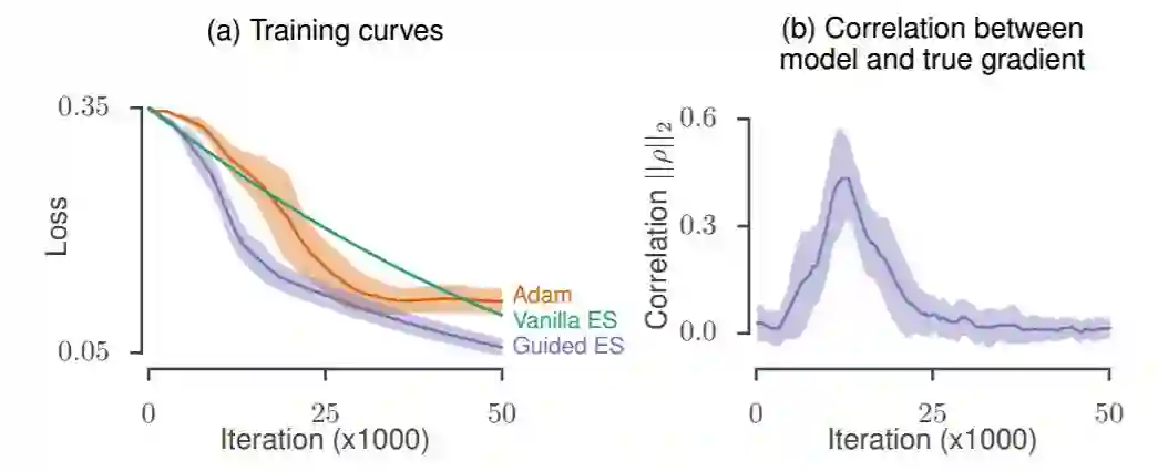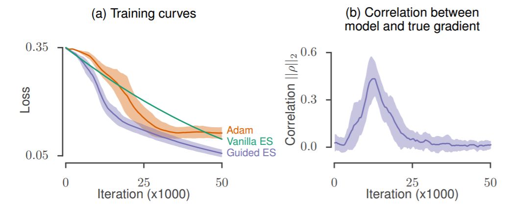 图 5:作为带引导的进化策略的引导子空间的合成梯度。(a)使用合成梯度最小化目标二次问题时的损失曲线。(b)带引导的进化策略的优化过程中合成更新方向和真实梯度的相关性。