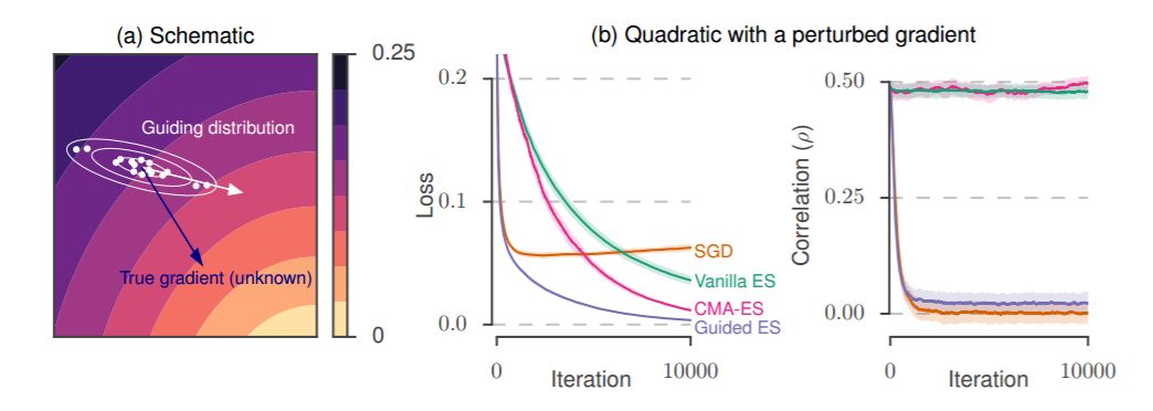 图 1:(a)带引导的进化策略示意图。我们使用沿着给定子空间(白色箭头)延伸的分布(白色等高线)进行随机搜索,而不是使用真正的梯度方向(蓝色箭头)。(b)对不同算法的二次损失进行比较,向梯度显式地加入一个偏置,用来模拟真实梯度未知的情况。优化过程中显示了损失(左图)以及代理梯度和真实梯度(右图)之间的相关性。实验细节请参阅 4.1 节。