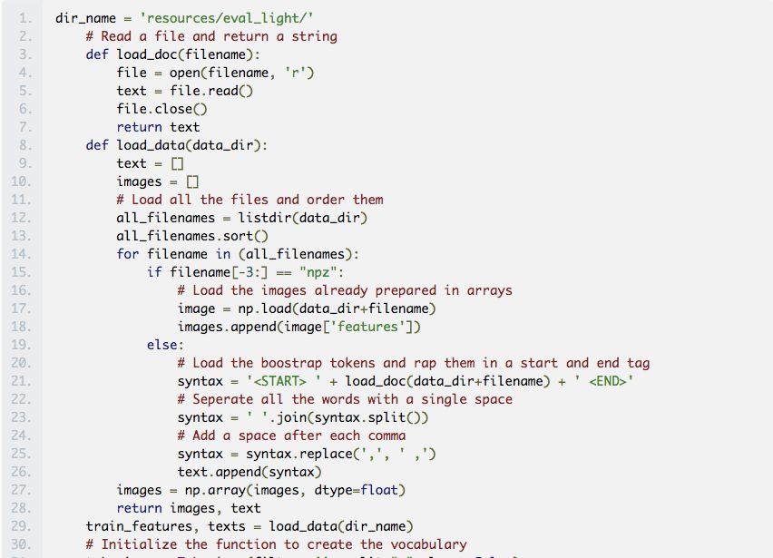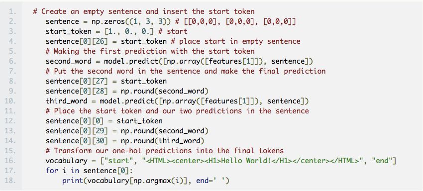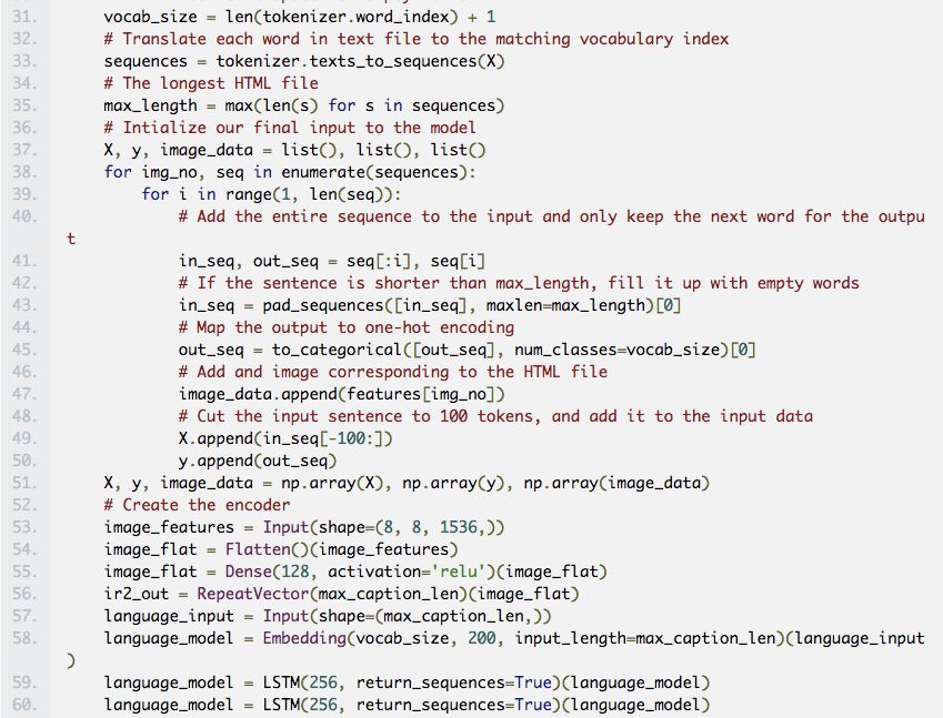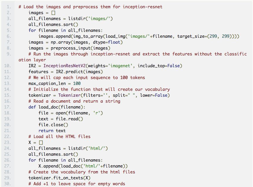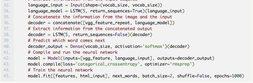 这些模型是基于 Beltramelli 的 pix2code 论文和 Jason Brownlee 的图像自然语言描述教程而构建的,代码使用 Python 和 Keras(一个基于 Tensorflow 的框架)编写。