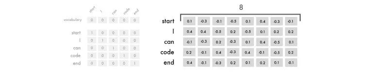 为了让神经网络理解这些标记,我使用了独热编码(one hot encoding)。因此“I can code”这一句就可以映射成:
