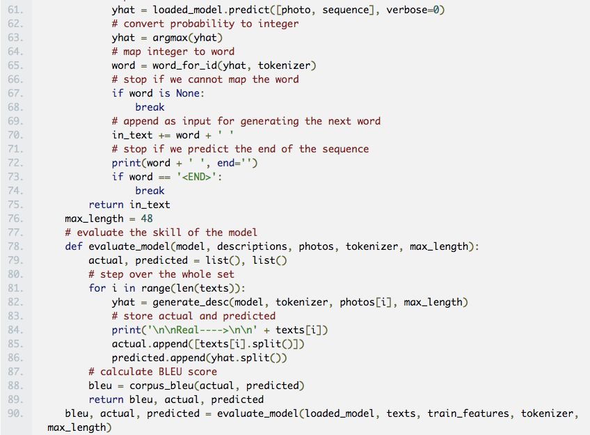 我用的是 BLEU 测评法,这是一种用于机器翻译和图像字幕模型的最佳实践。它按照 1 到 4 个单词序列把句子分成四个 gram。在下面的预测中的“cat”应该是“code”。