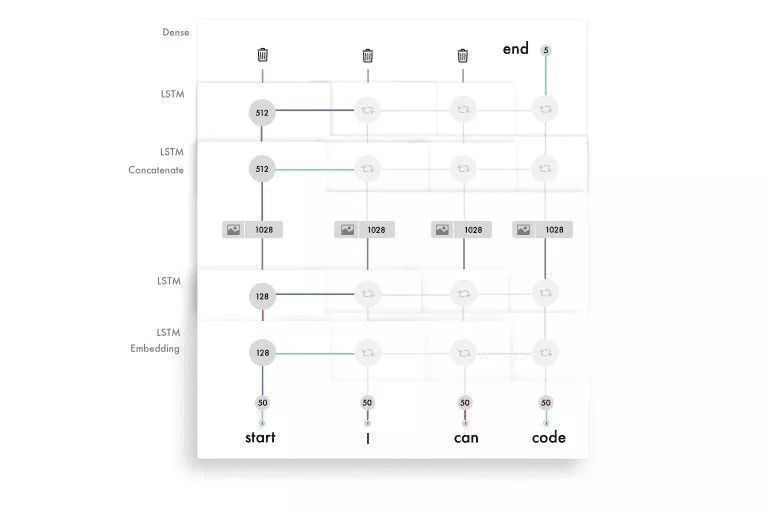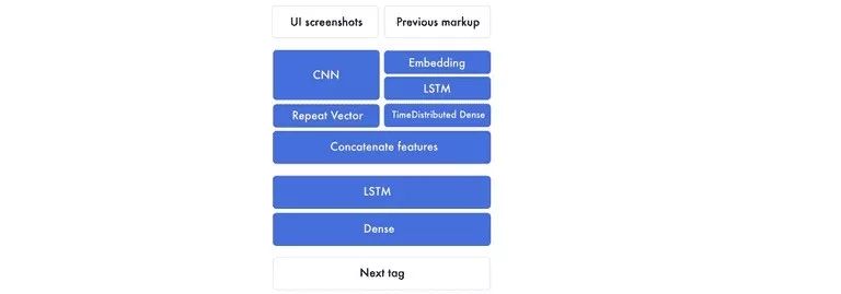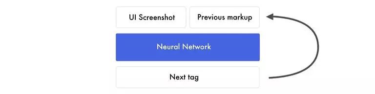 神经网络从数据中创建出不同的特征,用于连接输入和输出数据,创建模型,以便理解每张截图中所包含的内容和 HTML 语法,这就得到了预测下一个标签所需要的知识。